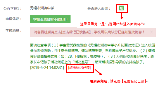 2、请于5月25日前登录无锡市教育局小升初报名系统平台仔细阅读“学校消息”,并点击[点击标记已读]按钮。