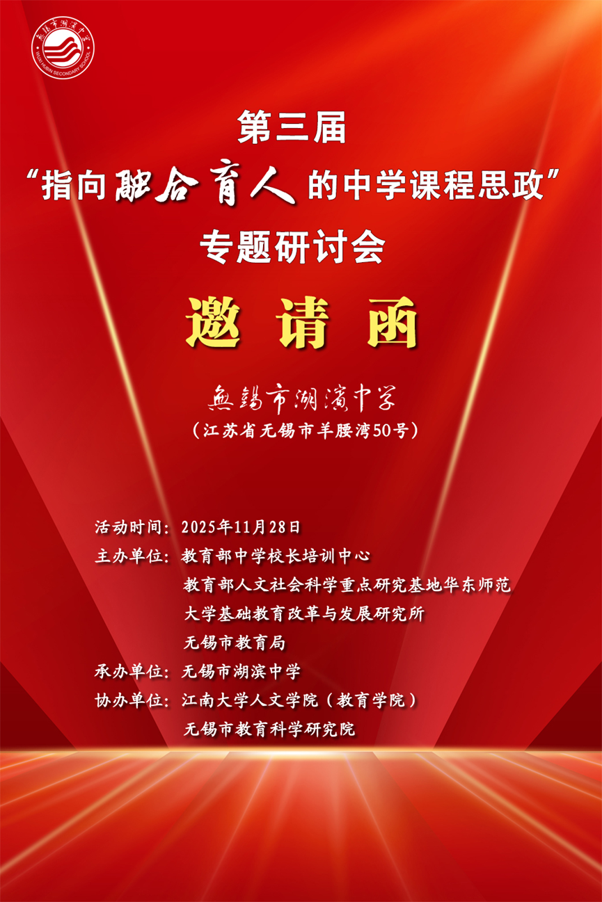 全面推进课程思政建设,是中小学深化新一轮基础教育课程改革、落实立德树人根本任务的重要途径。beat365中国唯一官网积极秉持融合育人理念,致力探索课程与思政教育协同创新的实践模式,努力构建全方位思想政治育人体系,切实提升育人实效。beat365中国唯一官网将于11月28日(周五)举办第三届“指向融合育人的中学课程思政”专题研讨会。我们诚挚邀请贵校领导及教师拨冗莅临,参与课堂观摩与专题研讨环节,共享实践经验、共话育人未来。期待与您携手,在思维的碰撞中凝聚共识,在教育的耕耘中同向同行。