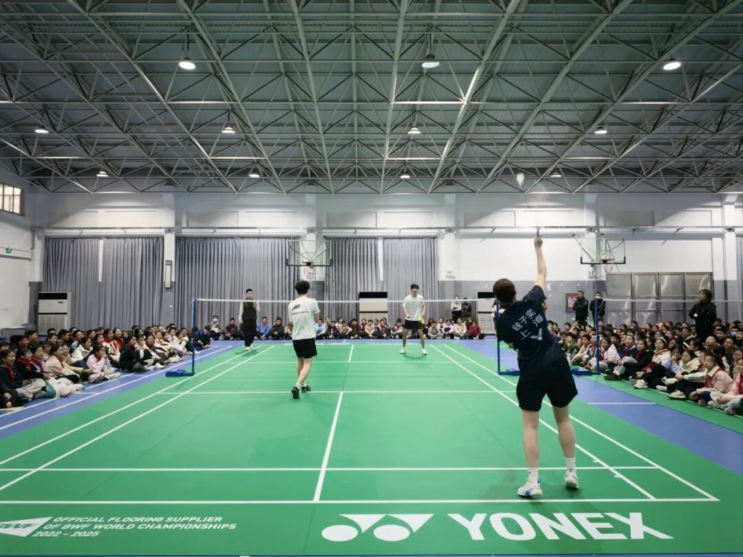 随后的表演赛环节,四位运动员联袂上演了一场精彩纷呈的趣味友谊赛。精准的扣杀、灵动的吊球、默契的配合,引得全场掌声与欢呼不断,也让同学们近距离感受到专业运动的魅力与激情。