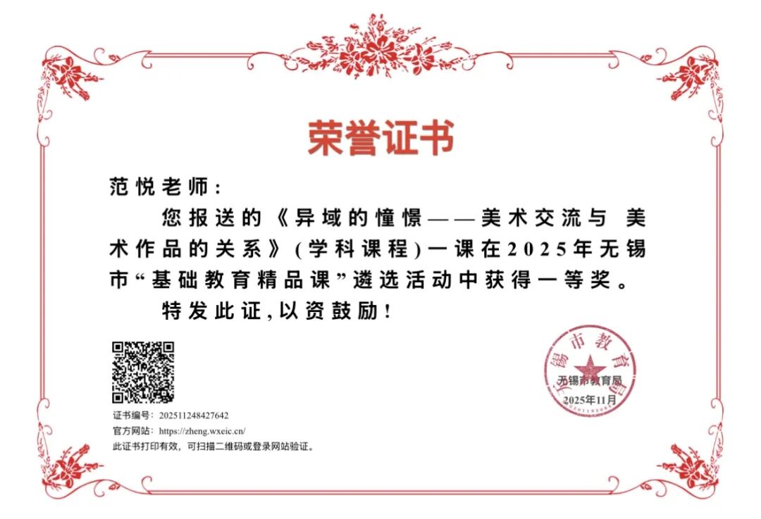 教师专业创作活力迸发,在无锡教职工网络文化主题活动绘画作品类评选中,十余位美术教师荣获特等奖、一等奖等荣誉,体现扎实的专业功底;全年师生完成创作、墙绘、海报、杯画等各类作品百余件,彰显美育实践的丰硕成果,为五星级学科组增添亮色。