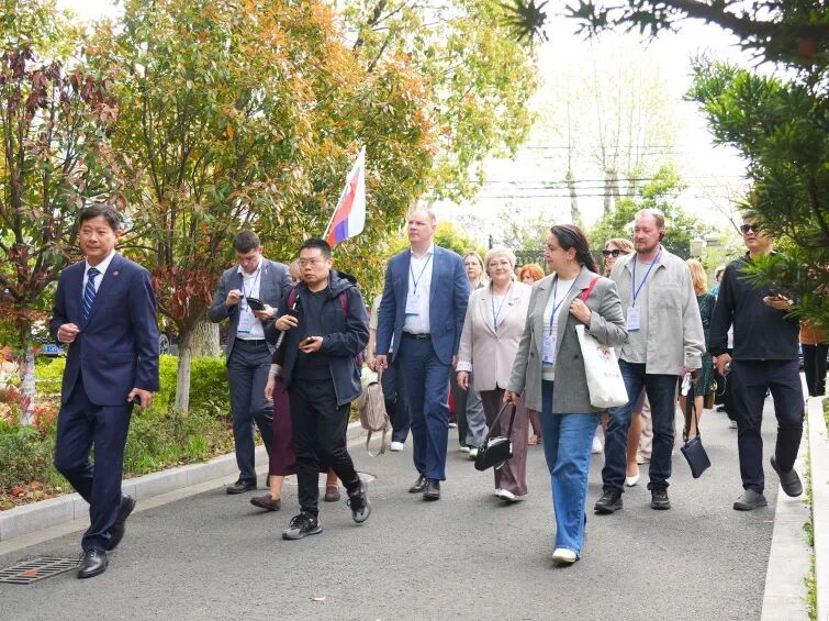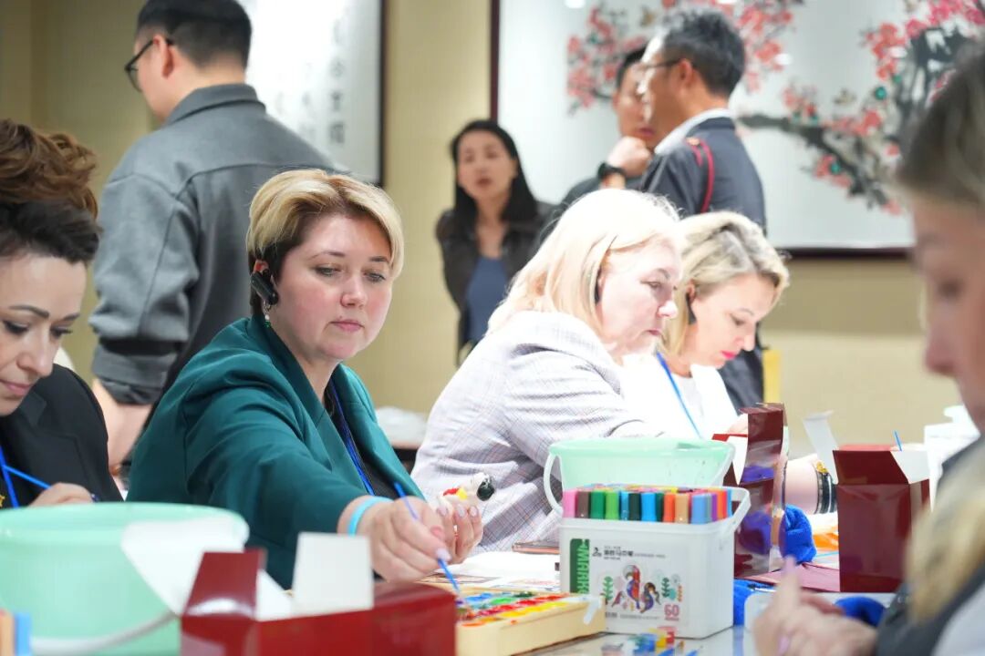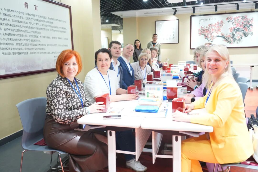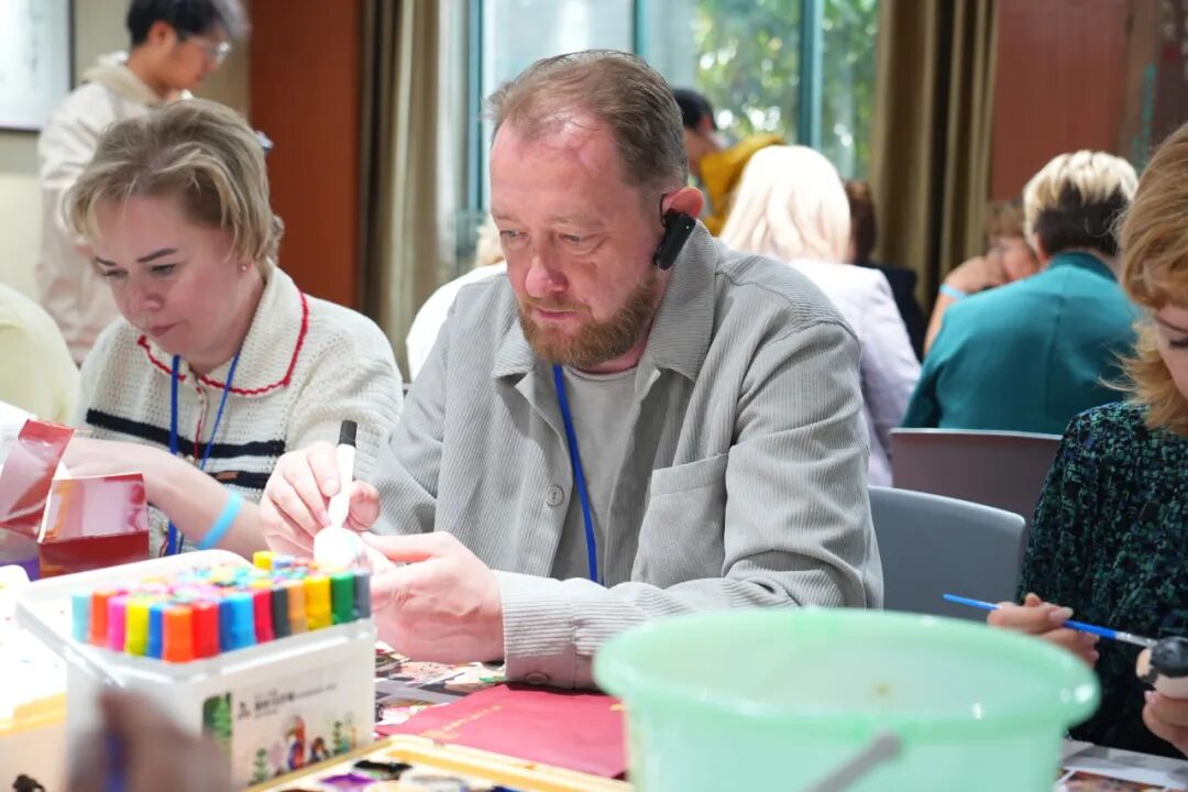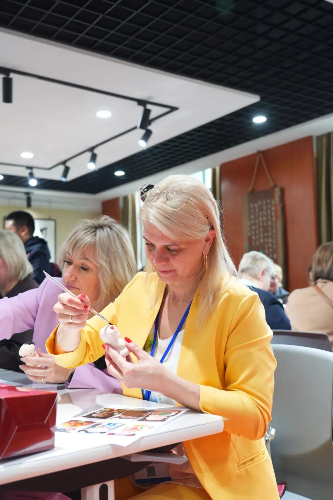 在惠山泥人体验区,时光仿佛慢了下来。俄方校长们轻执毛笔,蘸取天然矿物颜料,屏息凝神地为掌中的“泥塑阿福”勾勒眉眼、晕染纹饰。笔触虽显生涩,专注的神情却格外动人。
