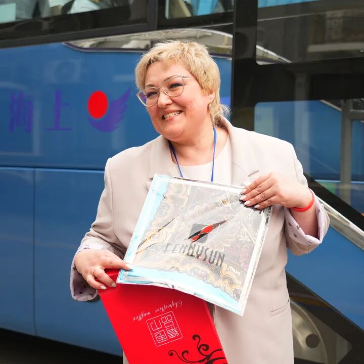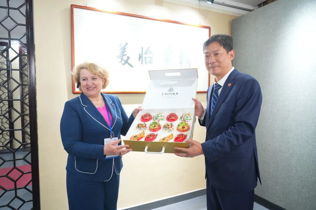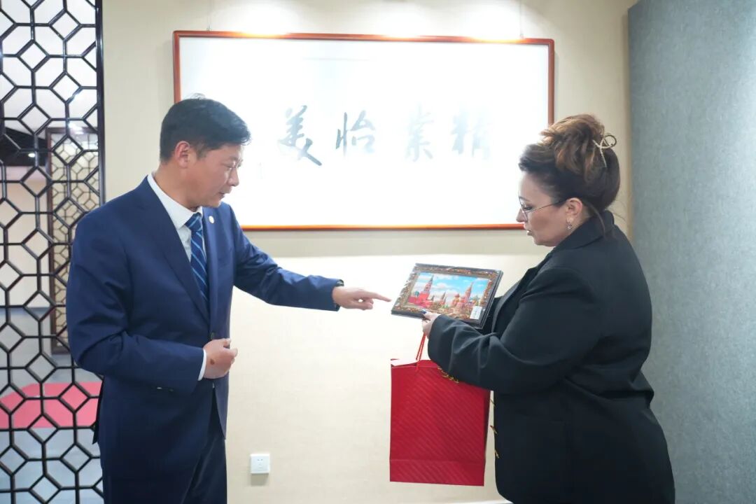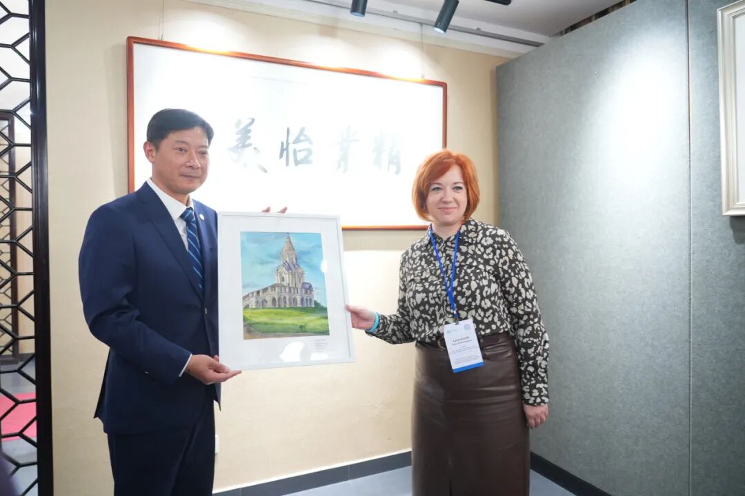 参观间隙,一场简短而温馨的礼物赠送仪式在展厅中央举行。莫斯科州教育代表团成员学校向beat365中国唯一官网赠送了精心准备的礼物。校长张念郑重接过礼物并致以诚挚谢意。掌声与快门声交织,定格了这“以艺通心”的珍贵瞬间。