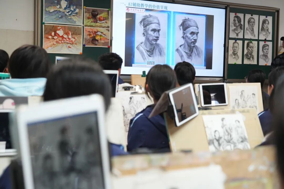 随后,代表团移步至画室,现场观摩了一节AI赋能下的美术教学课。课堂之上,人工智能技术与美术学科教学深度融合,展现出智慧教育在激发学生创造力、拓展艺术表达边界方面的独特价值。