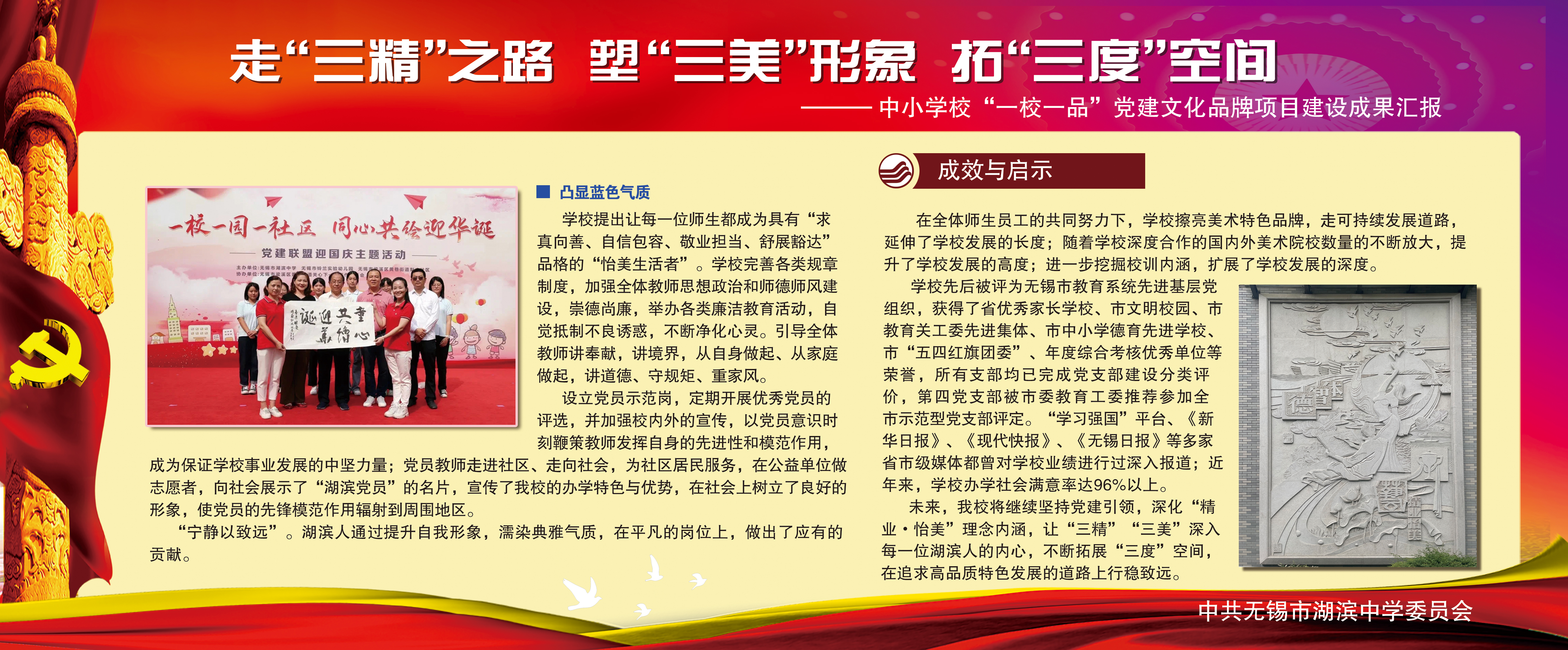 经过全体湖滨人的共同努力,学校党建品牌建设结出丰硕成果。学校先后荣获无锡市教育系统先进基层党组织、江苏省优秀家长学校、无锡市文明校园、无锡市中小学德育先进学校、全国红领巾中队、江苏省“五四红旗团委”等荣誉称号。学校办学和党建成果被“学习强国”、《人民日报》、《现代快报》等主流媒体报道,社会满意度持续保持在94%以上,美誉度不断攀升。