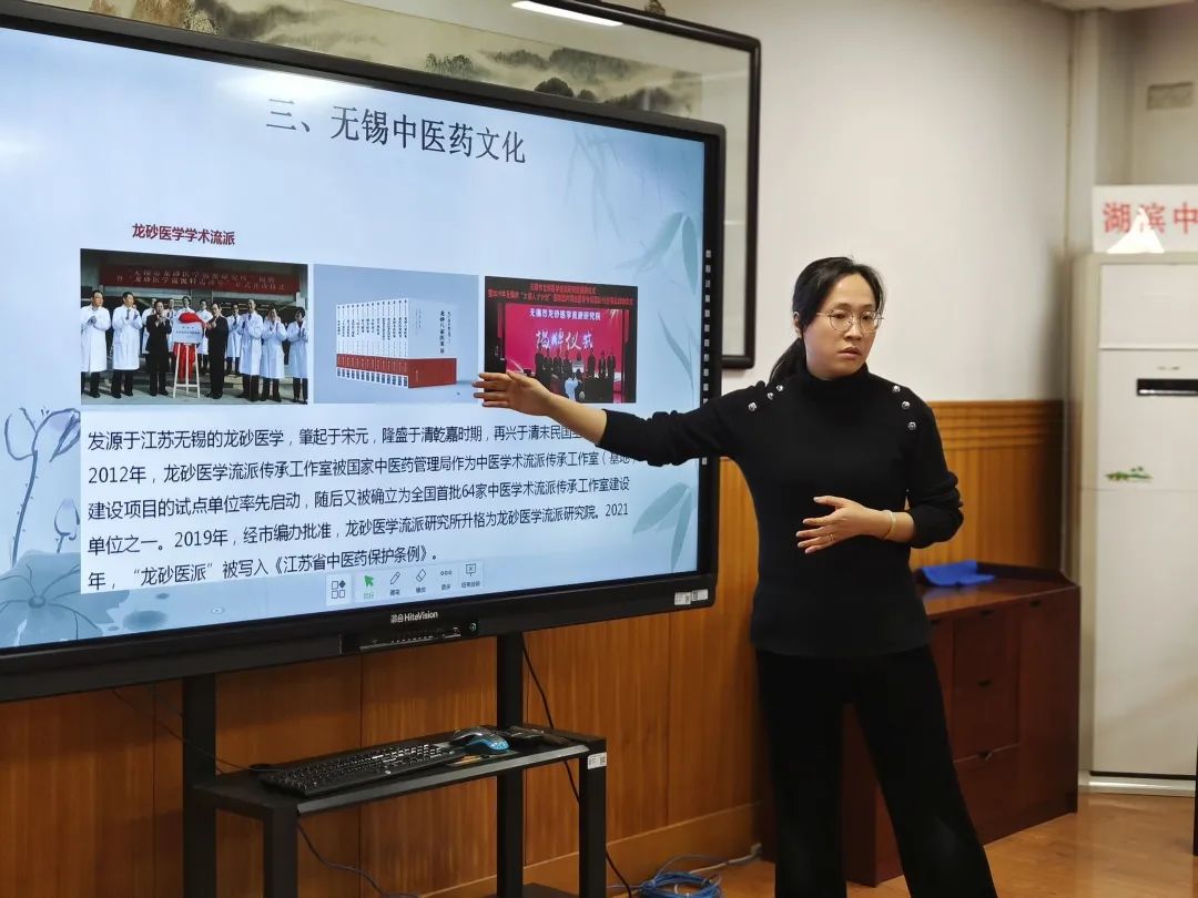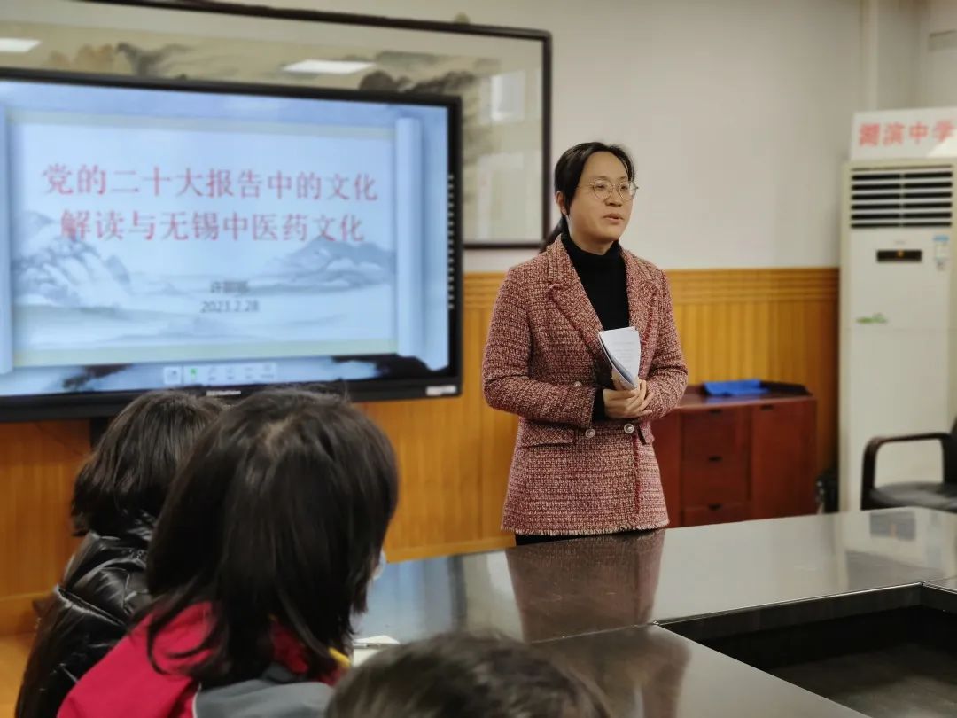 许老师长期致力于无锡文化挖掘研究、地域特色文创研发和中医药文化传播的推广工作,获得了多项荣誉。在许老师的精心准备下,与会师生跟着她开始了文化之旅……首先,许老师向大家介绍了文化的内涵,并以2022冬奥会为例,生动地讲述了丰富多彩的“中国风”元素,尽显中华文化底蕴;接着,许老师系统地解读了党的二十大报告中关于文化的重要论述,并时不时举例说明,号召新时代的青少年,尤其是青年团员要坚定文化自信,为实现中华民族伟大复兴凝聚起文化力量,引起了大家的共鸣;最后,许老师结合自己的专业,向大家介绍了无锡地区的中医流派和名医故事,结合教师群体用嗓过度的现状,重点推介了非遗项目——“黄氏喉科”在咽喉类疾病方面的显著疗效。讲座过程中,许老师介绍了自己对文化研究的独到见解,介绍了市中医医院开展的系列志愿者活动,并与师生展开互动,取得了良好的效果。