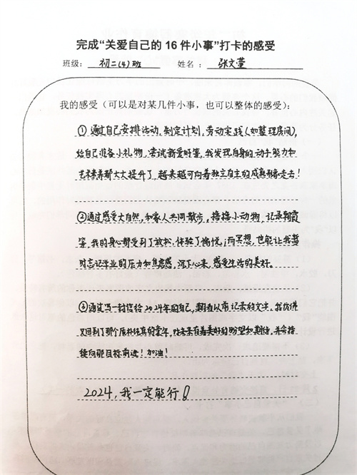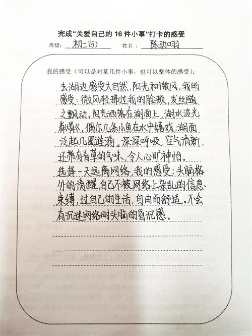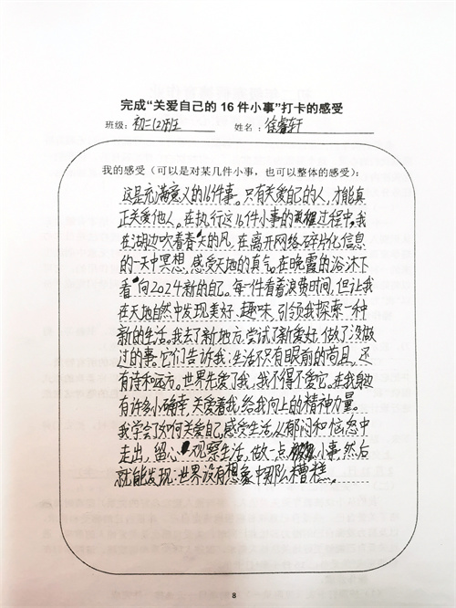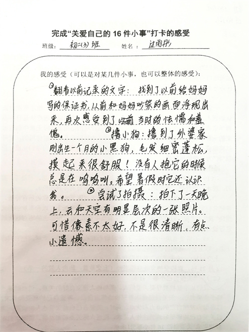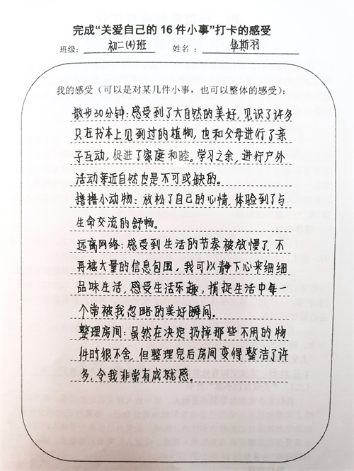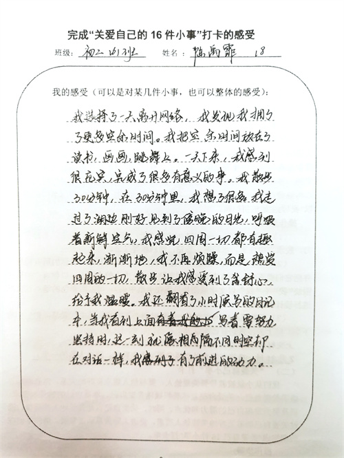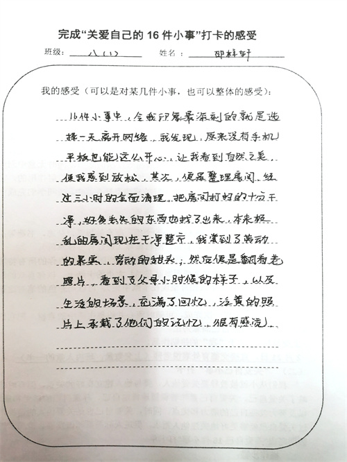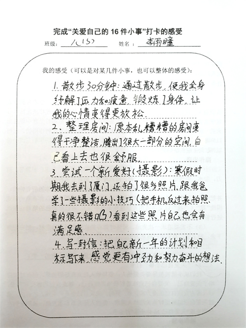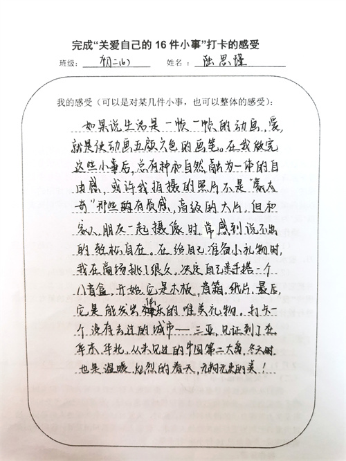 大多数时候我们被要求要照顾别人和在意他人的感受,但是却忽视了学会关爱自己也同样重要。关爱自己意味着积极地肯定自己、尊重自己的感受和需求,以及努力发掘自己的潜力和优点。同时,关爱自己也是关爱他人的前提,通过关爱自己能够更好地关注他人需求,促进人际关系和谐发展。假期里同学们积极完成关爱自我16件小事打卡,事虽小,感受却深。