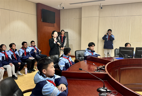活动伊始,学生们在杨法官的带领下参观了法庭,杨法官详细介绍了法庭的布局、功能以及审判流程,使学生们对法庭运作有了初步了解。最让同学们兴奋的是,他们还有机会亲自体验敲击法槌,感受法官宣判时的庄重与肃穆。随后,同学们又参观了少年法庭,这里的设计更注重对未成年人的关怀与保护。通过杨法官的讲解,大家了解到少年法庭在处理未成年人案件时采取的特殊措施,加深了对未成年人权益保护的理解。