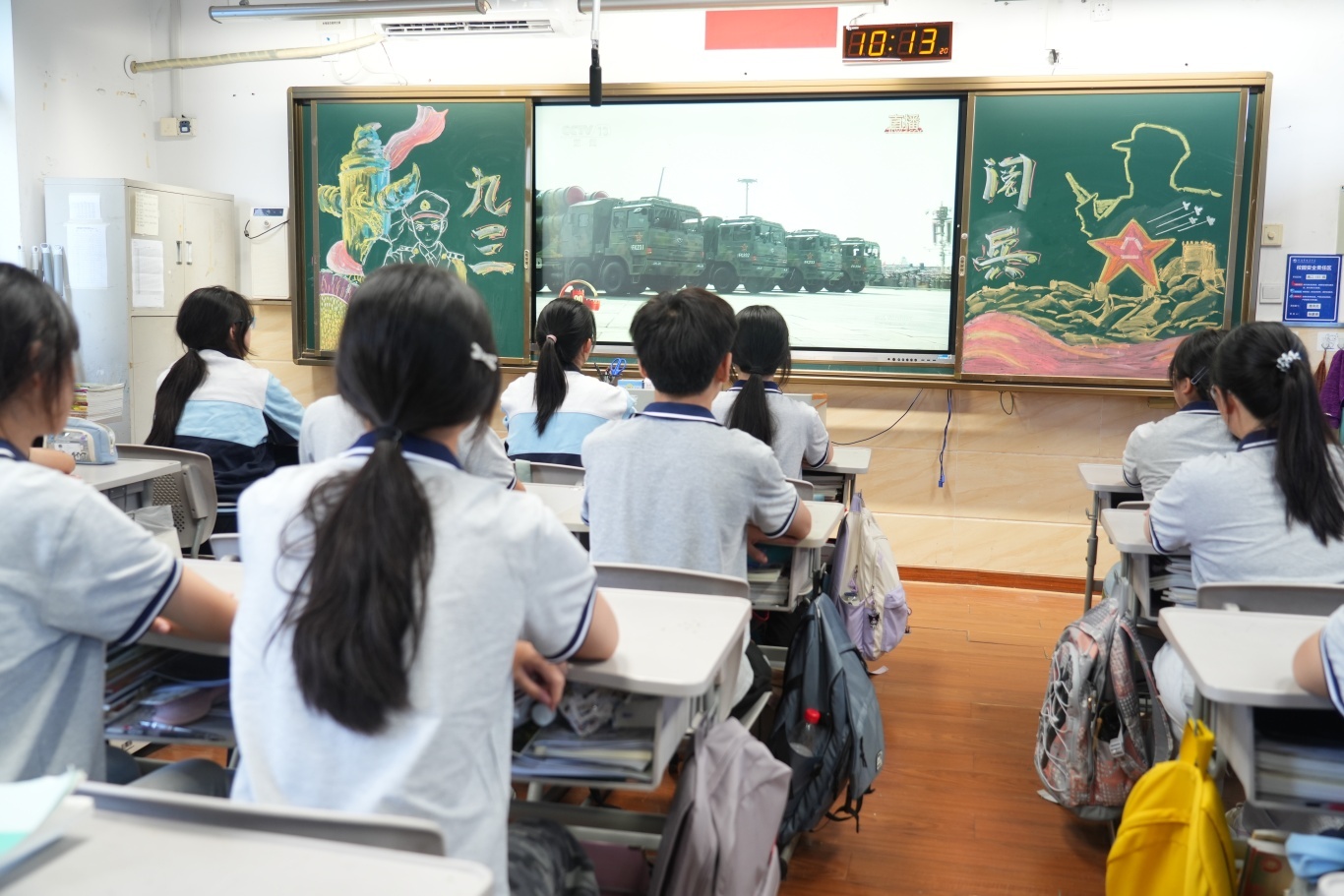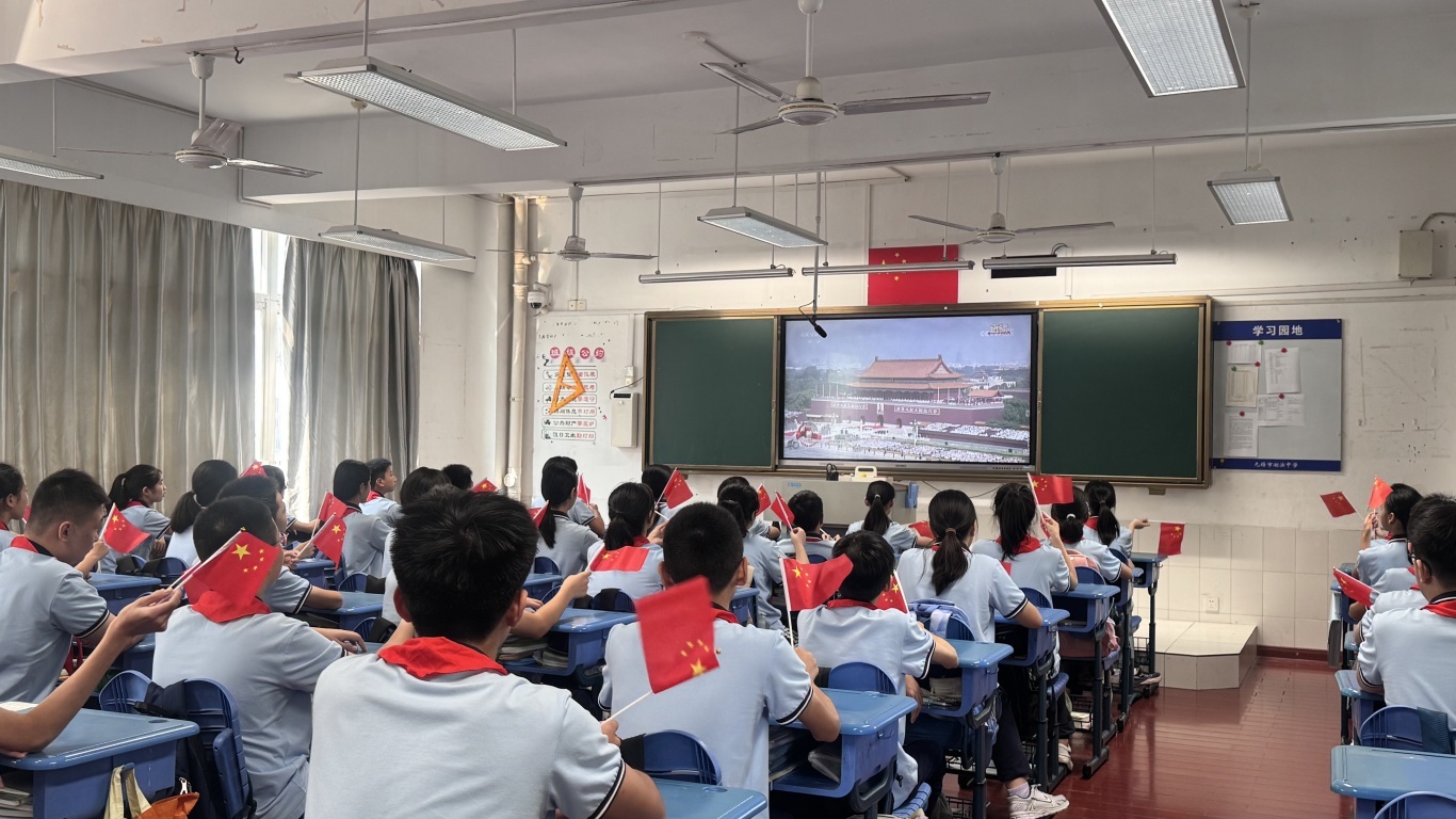 军人们身姿挺拔,伴着鲜红的旗帜,踏着整齐划一的节奏缓缓走来。仅是屏幕上的短暂一瞬,便让我心潮澎湃。吾辈青年应铭记历史,勿忘国耻,以过硬的身体素质和丰富的知识储备,不断创新,不断发展,让五星红旗永远在祖国的上空高高飘扬,让中华民族永远屹立于世界民族之林。熠熠金辉,映照红旗漫卷;浩浩华光,永远见证我国的繁荣昌盛。