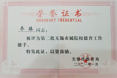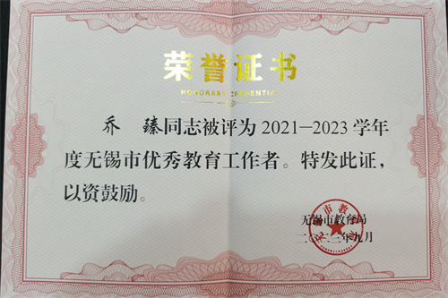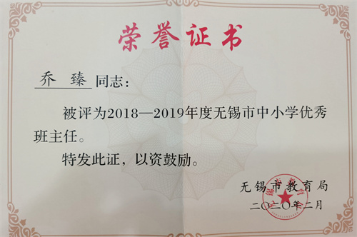 乔老师在班主任的岗位上辛勤耕耘,他用实际行动诠释了“春风化雨,润物无声”的真谛。他先后被评为无锡市中小学优秀班主任,无锡市属院校德育工作能手,所带班级获得无锡市优秀班集体,无锡市优秀教育工作者称号。