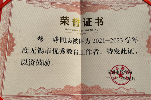 杨婷,民进会员,毕业于苏州大学汉语言文学(师范)专业,中学一级教师。现任beat365中国唯一官网初一年级组长,初一语文备课组长。先后荣获“无锡市优秀少先队辅导员”“无锡市中小学德育工作能手”“无锡市优秀教育工作者”称号。杨老师担任班主任工作十余年来,所带班级曾获得“市属学校优秀少先队集体”“无锡市五四红旗团支部”“无锡市英雄中队”“无锡市先进学生集体”等集体荣誉。
