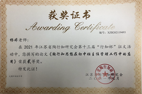 每当年轻班主任遇到疑难杂症的时候,她总是教授年轻教师一些做班主任的小技巧,以此排忧解难。为提升自身业务水平,杨老师还积极参与课题研究,撰写德育研究论文、反思、案例等,已有多篇德育论文在省级刊物发表或获奖。