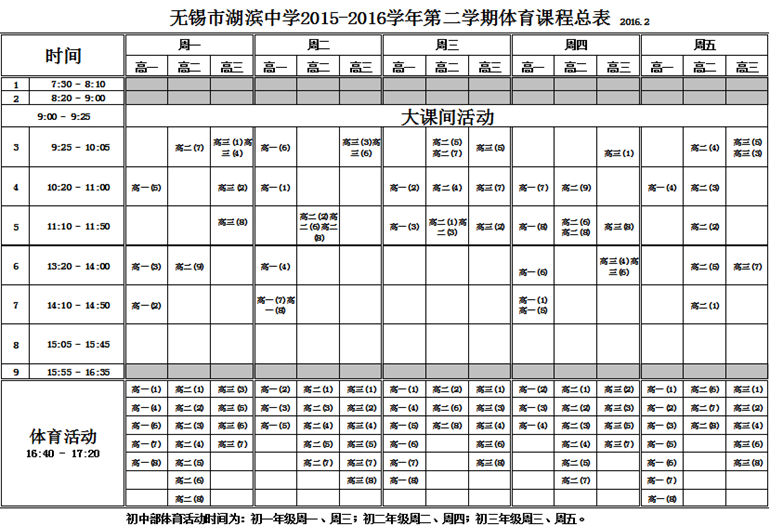 2015-2016学年第二学期体育课程总表(2月22日起)