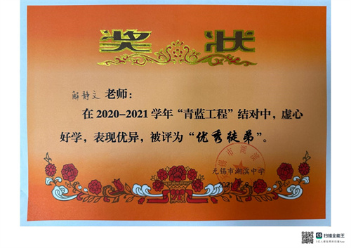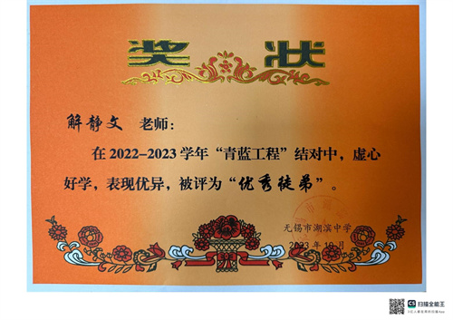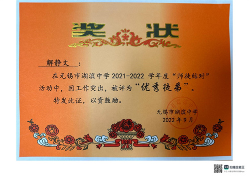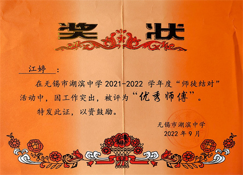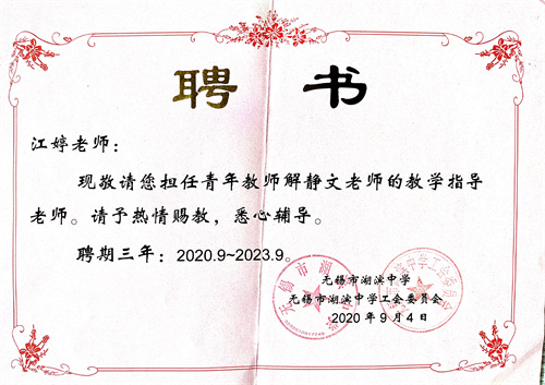 学高为师,身正为范。在湖滨中学的培养和老教师的提携下,曾经风华正茂的年轻教师,如今已成长为厚积薄发的骨干力量。江老师始终不忘饮水思源,常怀感恩之心,努力用自己的行动让这份关爱与责任薪火相传。和青年教师解静文结为师徒的三年时间里,她甘为人梯、乐于奉献,充分利用学校青蓝结对工程的平台优势,为徒弟的专业成长提灯引路。如今解静文老师已渐渐褪去青涩,在湖滨教学的舞台上崭露头角,短短三年多时间便获得多项市级荣誉,展望未来、更加可期。