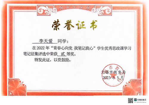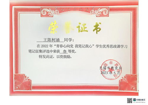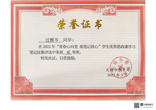 指导学生参加无锡市2022年“青春心向党 我笔记我心”学生优秀思政课学习笔记评比征选获二、三等奖。