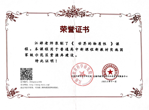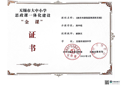 2023年3月,由她执教的《携手共建强富美高新无锡》被评为无锡市大中小学思政课一体化建设“金课”。