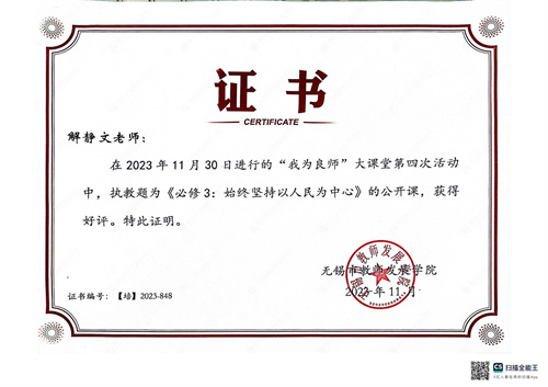 2023年11月,在无锡市“我为良师”大课堂第四次活动中,她执教题为《必修三:始终坚持以人民为中心》的公开课,获得好评。